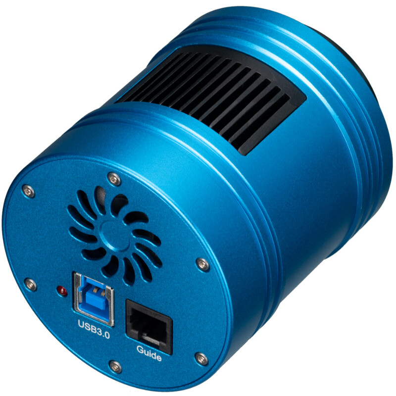Sensor: Das Geheimnis der hohen Lichtempfindlichkeit besteht in dem neuen rückseitig belichteten Exmor CMOS-Sensor von SONY. Dadurch wird die Quanteneffizienz auf bis zu 77 % bei 533 nm gesteigert, was eine extrem hohe Lichtausbeute bedeutet und somit besonders helle und kontrastreiche Fotos liefert. Außerdem sorgt der besonders niedrige Rauschpegel dieser neuen Chip-Generation von SONY für eine außergewöhnlich hohe Brillanz und es ist keine aktive Kühlung erforderlich. Dennoch besitzt diese Astro-Kamera zur Wärmeableitung eine aufwendige innere Struktur aus Aluminium und einen per Software zuschaltbaren Lüfter. Durch die hohe native Pixelauflösung von 3840x2160 sind in Kombination mit geeigneten Teleskopen sehr schöne Übersichtsaufnahmen des Mondes, aber auch detailreiche Planetenaufnahmen möglich.