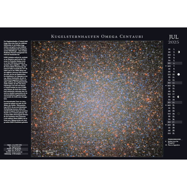 Einzigartig ist der ausführliche Text, der von Fachastronomen geschrieben wurde. Er erläutert, was eigentlich genau hinter jedem Himmelsobjekt steckt. Auf jedem Kalenderblatt befindet sich auch eine Datentabelle, die unter anderem zeigt, in welchem Sternbild das Objekt am Himmel steht.