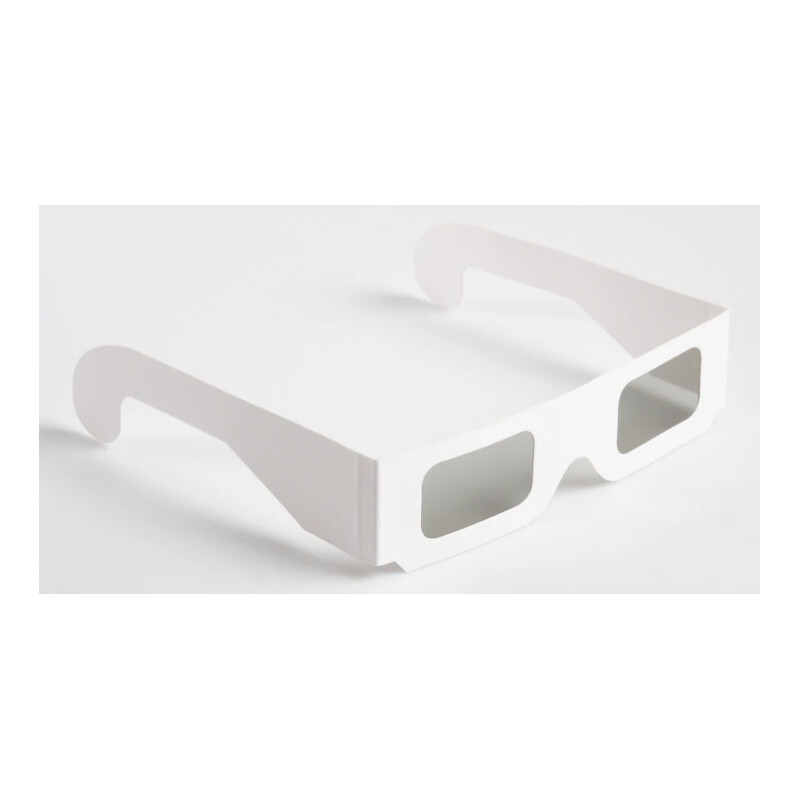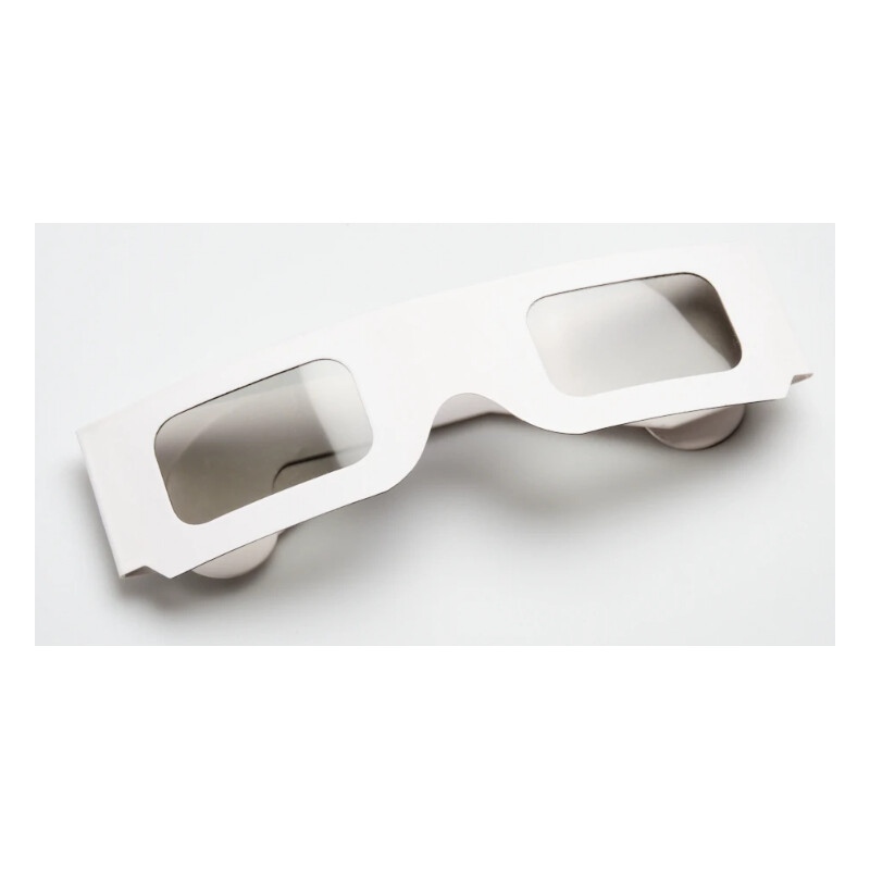Polarisations-Brille für 3D-Projektionen. Sie ist unerlässlich, um projizierte 3D-Dias oder Filme zu betrachten. Entsprechend dem gebräuchlichsten Projektionsverfahren sind die Filterachsen für die beiden Augen um 45° bzw. 135° geneigt. Die verwendete Folie ist identisch mit der Polarisations-Filterfolie von Astromedia und sitzt in einem doppellagigen, stabilen Kartongestell.