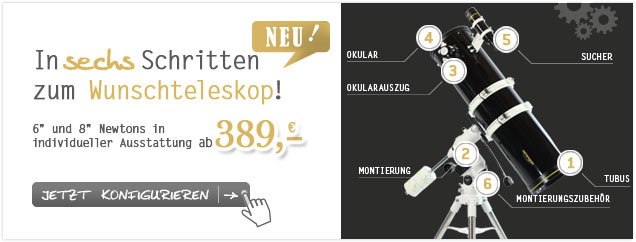 Das Gute an dem Teleskop-Konfigurator ist, dass Sie zu jedem Zeitpunkt einen Überblick über Ihre Kosten haben und durch wenige Klicks Ihr Wunschteleskop und das Zubehör so konfigurieren können, dass es in Ihr für das Hobby angesetzte Budget passt – mehr Transparenz geht nicht! Die Preisspanne reicht übrigens von € 389,- bis € 919,-.