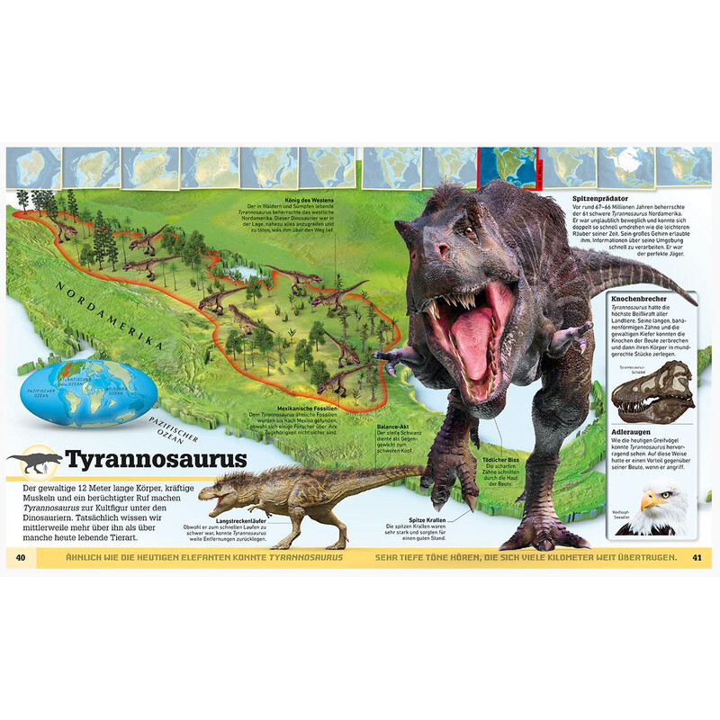 Wo lebte T-Rex und wie sah unsere Welt vor Millionen von Jahren aus? Das kann jetzt in diesem sensationellen Dinosaurier-Atlas selbst entdecken: Faszinierende 3-D-Karten zeigen die Kontinente im Wandel, die wichtigsten heutigen Fossilienfundstätten und stellen über 40 Dinosaurier und andere Urzeitwesen in ihrem Lebensraum vor. Das ist spannendes Dino-Wissen – greifbar gemacht für Groß und Klein!
