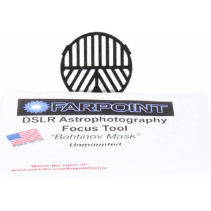 Die Fokusmaske nach Pavel Bahtinov erleichtert das exakte Fokussieren, auf das es insbesondere in der Astrofotografie ankommt. Die Maske wird vorne am Tubus, bzw. Objektiv angebracht. Beim Blick auf einen Stern erzeugt sie ein Strahlenmuster. Wenn der lange Strahl die beiden etwas kürzeren in der Mitte symmetrisch schneidet, ist der Fokus korrekt eingestellt. Durch die vielen Öffnungsschlitze ist die Bahtinov-Maske auch an relativ lichtschwachen Sternen einsetzbar. Das ist ein Vorteil gegenüber der klassischen Scheinerblende.