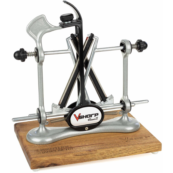 Le V-Sharp Classic II est un aiguiseur de couteaux avec des surfaces d'affûtage diamantées interchangeables. Il convient parfaitement à l'affûtage des couteaux de cuisine, de boucherie et de chasse et est simple d'utilisation. L'unité d'affûtage peut être réglée à trois angles différents : 20°, 25°, 30°. Les unités d'affûtage diamantées interchangeables sont livrées en standard avec une granulométrie de 325ér, l'arrière servant à retirer les couteaux. La construction robuste en zinc moulé sous pression est dotée d'un revêtement en caoutchouc amovible sur la base, qui assure une bonne stabilité sur les surfaces de travail.