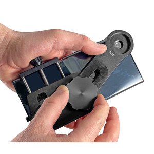 Le bras optique de précision sert à aligner l'objectif de la caméra du smartphone sur l'oculaire de la longue-vue. Une fois dans la position souhaitée, vous pouvez bloquer le bras optique à l'aide de la vis de fixation pour le maintenir en place. Une fois fixé, il reste parfaitement en position.