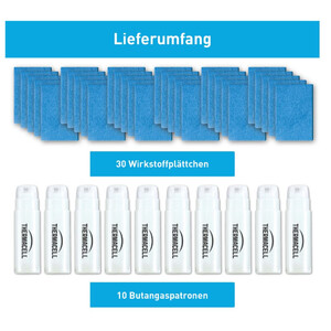 - Contient 10 cartouches de gaz et 30 pastilles d'agent actif