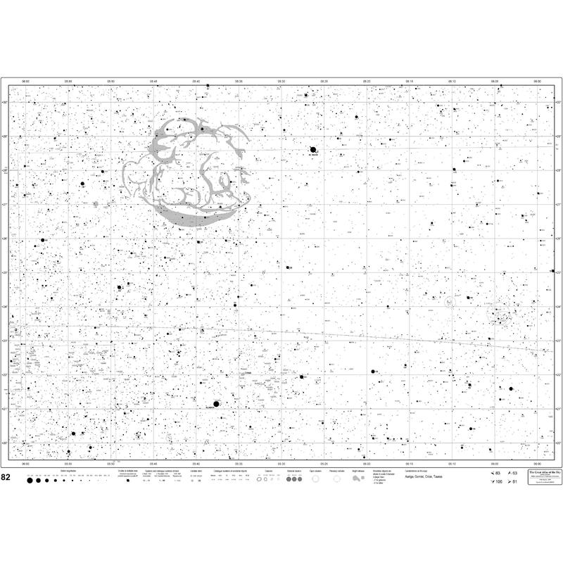 Avec un matériel aussi détaillé, le problème se pose souvent que les cartes individuelles ne montrent que de très petits extraits. Cela peut rendre la recherche d'objets difficile et il manque une vue d'ensemble. Les cartes de cet atlas ont une taille de 61 x 43 cm. Cela permet, par exemple, de représenter la moitié de la constellation Orion sur une seule carte.