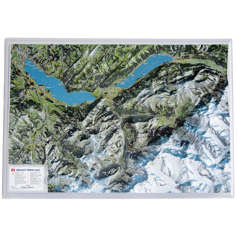 Carte en relief 3D authentique de l'Oberland bernois avec hachures de relief et couches d'altitude colorées dérivées de modèles de terrain à haute résolution. Nous avons cherché à restituer graphiquement pour l'observateur la précision d'une photo aérienne.