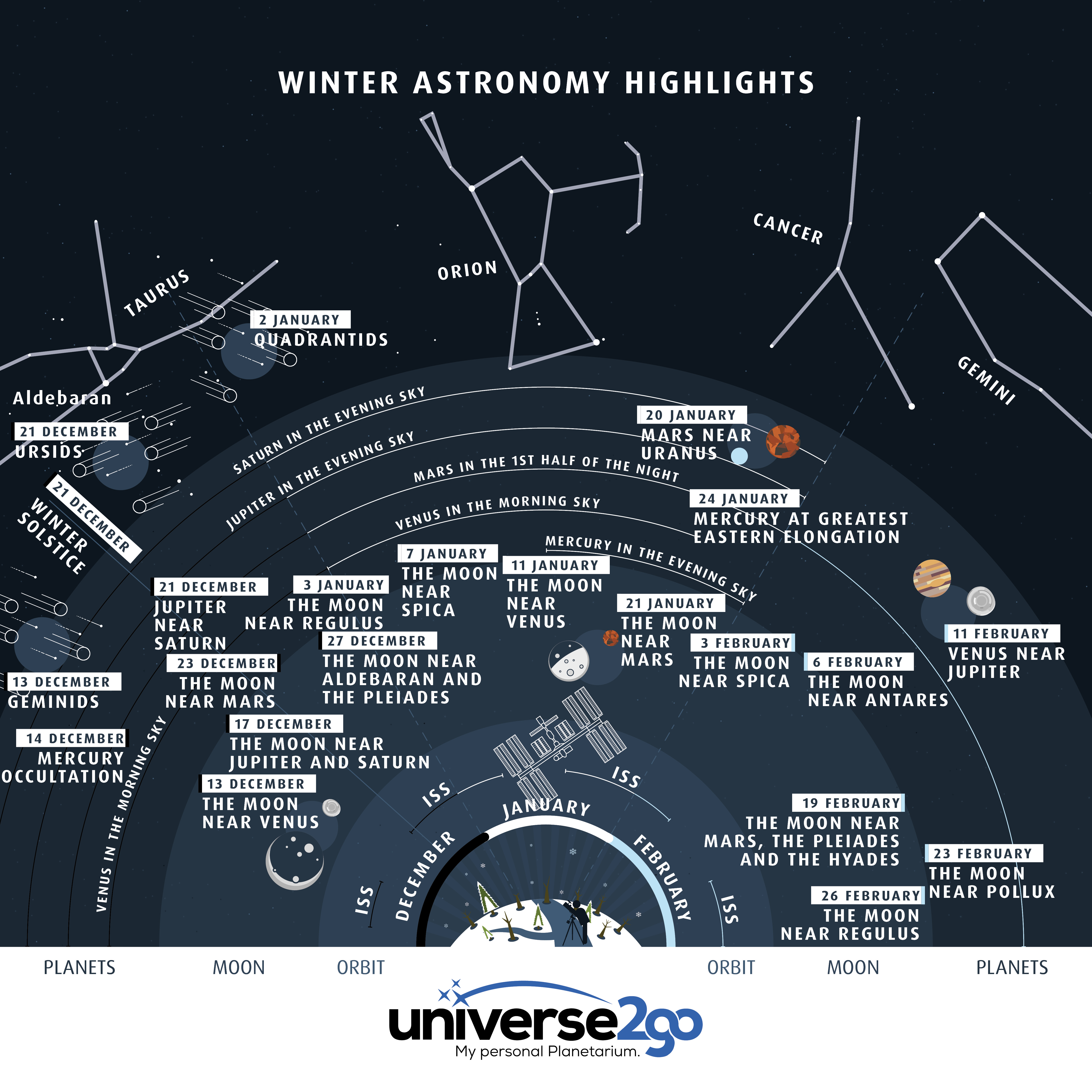 An extremely close encounter between Jupiter and Saturn, Mars and Uranus together in your field of view and the Geminids coincide with a new Moon. Once again there are all sorts of reasons to take a look and admire the starry sky. In the infographic “Astronomy Highlights in Winter 2020/21”, you have all the important celestial events occurring in the next three months at a glance. We wish you lots of observing pleasure!