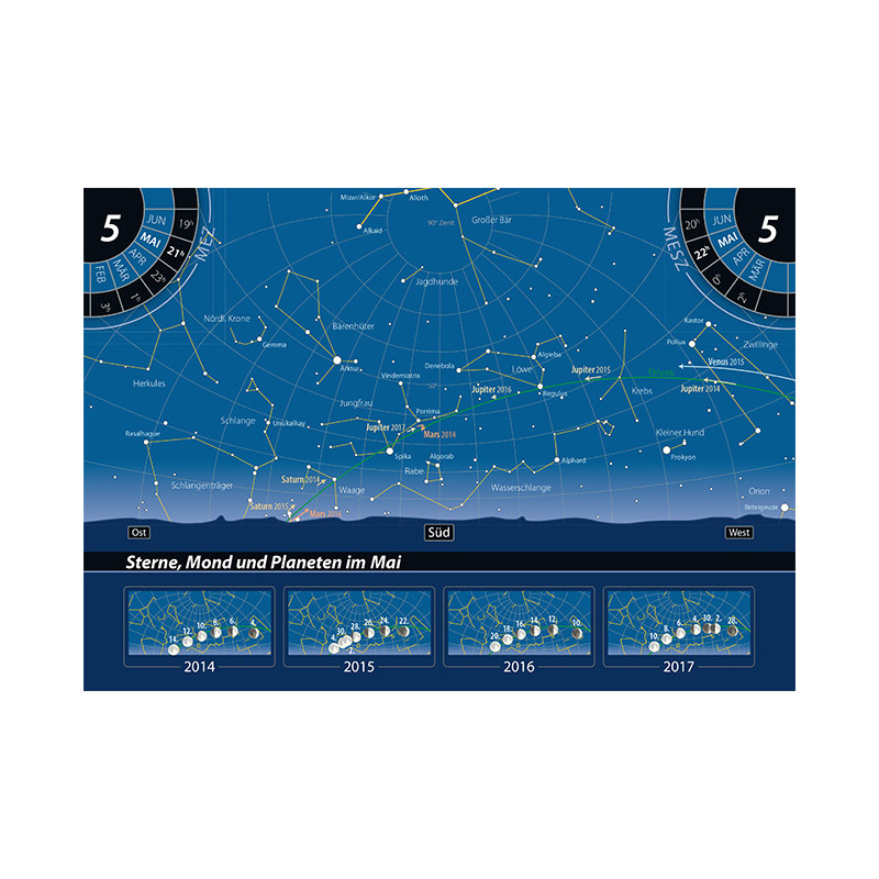 Des illustrations explicatives montrent clairement comment se produisent les mouvements du ciel. Des cartes claires indiquent le chemin vers les étoiles et les constellations les plus brillantes, sans submerger l'utilisateur d'informations détaillées. Elles indiquent également la position des planètes et de la lune pour les années à venir.