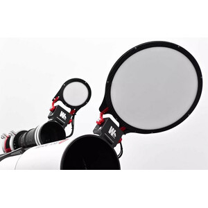 Un masque flatfield crée une surface blanche avec une luminosité définie. Il suffit de placer le masque sur l'optique de votre télescope et de photographier la surface blanche. Cette prise de vue dite « flatfield » vous permet de déterminer la répartition exacte de la luminosité de votre système optique et de corriger la courbe de luminosité de vos photos astronomiques lors du traitement des images.