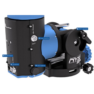 NYX est la déesse grecque ancienne de la nuit et Pegasus Astro offre maintenant sous ce nom une autre monture puissante avec la technologie Harmonic Drive et jusqu'à 14kg de charge utile - et cela sans avoir besoin d'un contre-poids ! Ceci est assuré par la technologie de transmission Harmonic Drive/Strainwave. L'entraînement assure un fonctionnement sans jeu avec un couple élevé. Un boîtier en alliage d'aluminium entièrement usiné CNC, anodisé noir et bleu, ainsi qu'une sélection de composants de haute qualité (moteurs pas à pas, engrenages à arbre) au sein de la monture garantissent un fonctionnement sans faille pendant de nombreuses années.