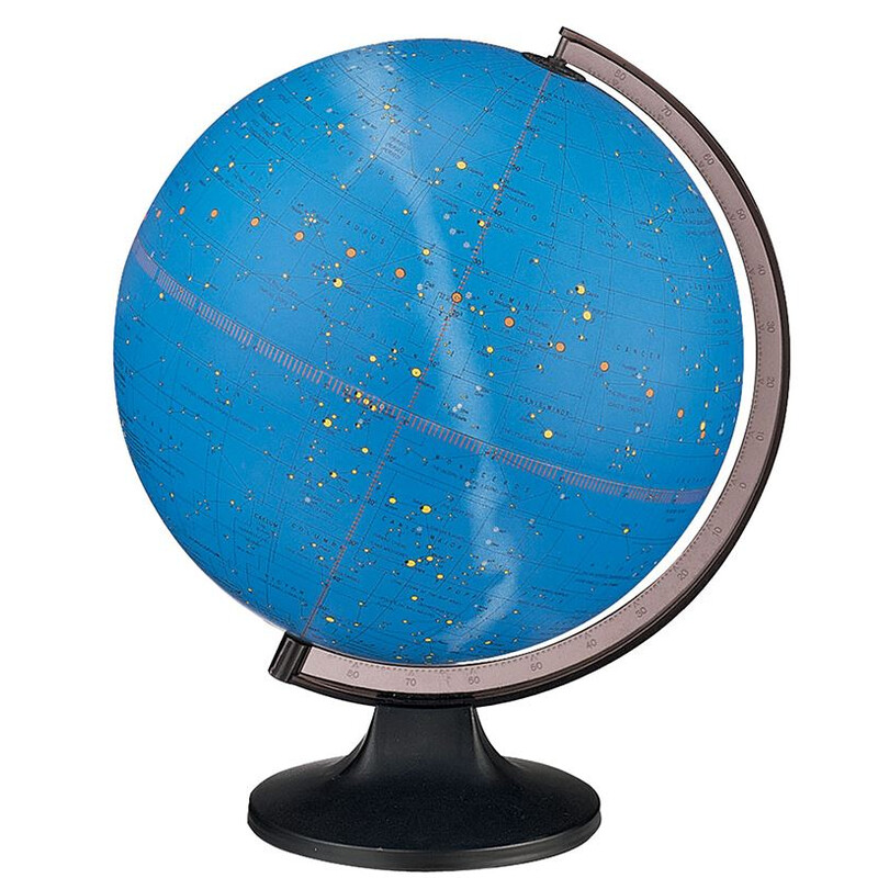 Ce globe représente le ciel étoilé avec les 88 constellations officielles. Les constellations sont représentées par des silhouettes et leurs limites sont indiquées. Les étoiles sont imprimées en différentes tailles en fonction de leur luminosité.