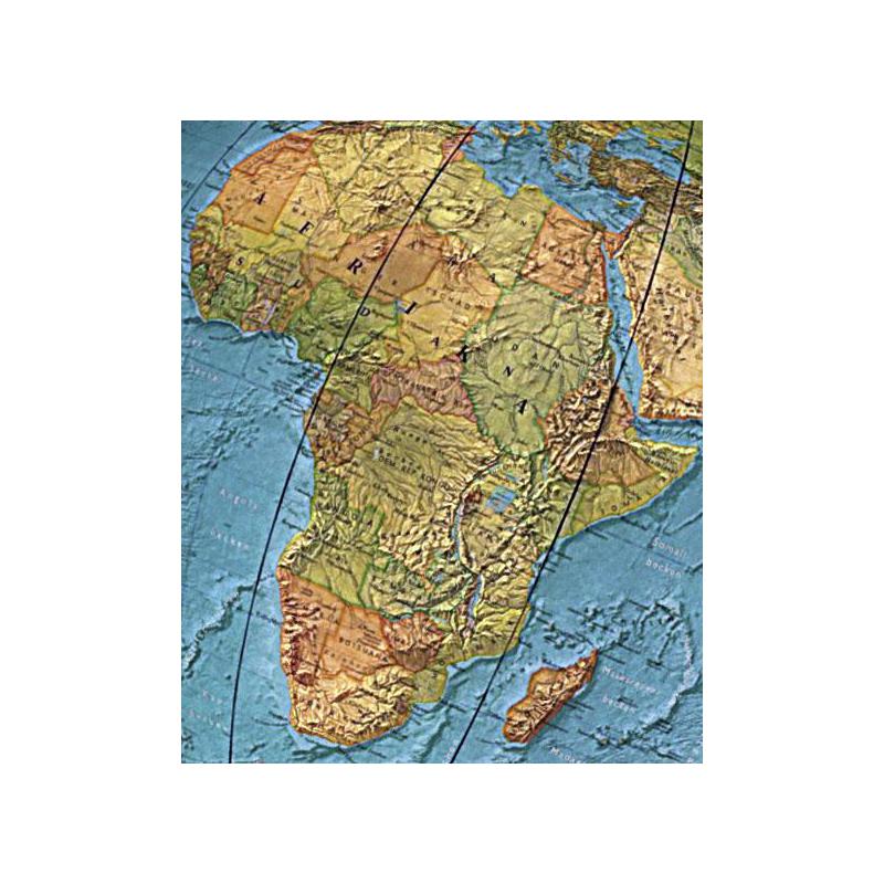 La carte sol végétation représente la surface de la terre avec les hautes montagnes, les forêts, les zones cultivées, les savanes, les déserts et en blanc les régions polaires ou les glaciers. L'impression de relief des montagnes et des fonds marins est particulièrement saisissante.