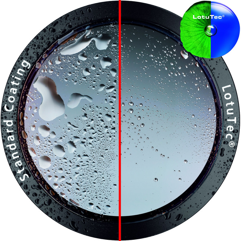 Wie beim Lotusblatt oder Entengefieder perlen Wassertropfen von der Linse ab. Die LotuTec®-Beschichtung auf der Objektiv- und Okularlinse sorgt dafür, dass Wasser oder Schnee von den Oberflächen abperlen. Dadurch, dass weder Wasser noch Schmutz mit der Linsenoberfläche des VICTORY HT eine Verbindung eingehen können, müssen Sie weniger putzen und haben mehr Zeit für Ihre Naturbeobachtungen.
