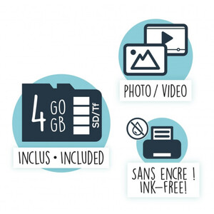 Une carte micro SD de 4 Go pour enregistrer les photos et créer des vidéos est également incluse. Le câble USB permet de transférer ces images sur un PC. Le câble USB sert également à recharger la batterie lithium 7,4 V intégrée.