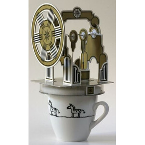 Placez ce moteur Stirling en parfait état de marche sur une tasse de café bouillant (du thé ou de l'eau conviennent également), donnez une petite impulsion vers la gauche au volant d'inertie et cet appareil peu exigeant se met à battre silencieusement pendant une heure !