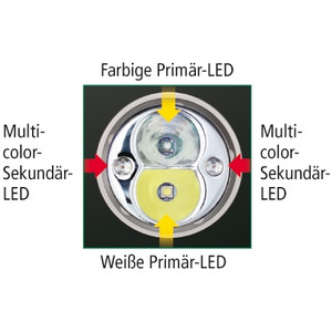 La LED primaire est de couleur bleue. Elle peut être réglée sur 3 niveaux de luminosité. Particulièrement adaptée à la pêche et aux interventions des autorités, car l'éclairage bleu n'est pas perceptible par les poissons et permet de mieux repérer les liquides.