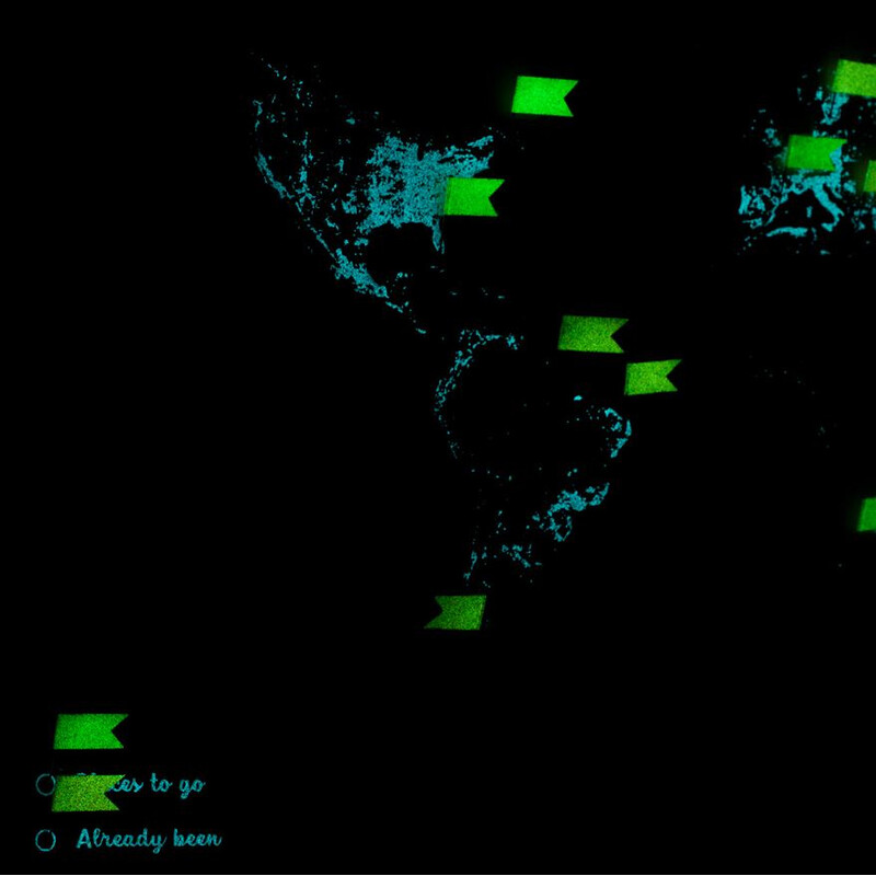 Vivez une expérience unique avec la carte fluorescente. Nous savons que vous aimez voyager et que vous aimez vous souvenir de vos voyages lorsque vous décorez votre carte... Imaginez que tout cela ne disparaisse pas lorsque vous éteignez la lumière ! Ouvrez votre créativité à ce nouveau monde.
