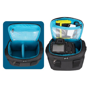 Ce sac à bandoulière peut accueillir une caméra Syterm ou une caméra reflex numérique compact avec objectif standard et un flash ou un deuxième objectif.