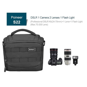 Le sac à bandoulière Poineer peut accueillir des appareils de prise de vue de différentes tailles avec plusieurs objectifs, des caméras sans miroir aux caméras professionnelles avec objectif 70-200F2.8 (les modèles S22 et S26 peuvent accueillir 1 reflex numérique avec objectif 70-200F2.8). Il est disponible en trois modes de transport : sac à main, sac à bandoulière et sac banane. La poche avant, la poche latérale et la poche en filet offrent de l'espace pour les cartes mémoire, les batteries, les câbles et autres accessoires. Disponible en 4 tailles