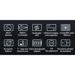 Grâce à son aplanisseur intégré, le FF80 offre de grands avantages pour l'astrophotographie : il éclaire les capteurs plein format et garantit une image fine avec des étoiles ponctuelles sur l'axe. L'apochromat est livré avec un pare-buée coulissant, un porte-oculaire manuel 3" avec rotation à 360°, un sabot de viseur Vixen/GP, ainsi que quatre adaptateurs appareil-photo différents (M76, M68, M54 et M48). Le tube pèse 3,9 kg, avec les colliers et le rail, le poids total est de 4,7 kg.
