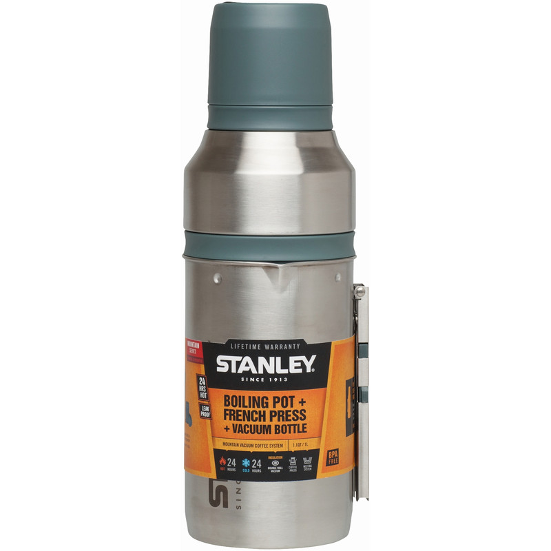 Das Mountain Vakuum Coffee-System der US-Marke Stanley ist ein praktischer Begleiter für unterwegs. Durch das Stanley Press Filter System lässt sich der Kaffee nicht nur zubereiten, sondern dank der doppelwandigen Vakuum-Flasche auch bis zu 24 Stunden lang heiß halten. Ein Edelstahlgefäß mit klappbarem Henkel dient als Kochtopf. Der Verschluss bietet Stauraum für ausreichend Kaffeepulver. Über dem Flaschenverschluss sitzen zwei Trinkbecher.
