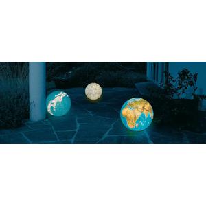 Earthball Duorama - die etwas andere, äußerst markante Lichtquelle für den Innen- und Außenbereich. Sie sorgt für eine puristische, sehr ästhetische Eleganz auf der Terrasse, im Garten oder im Wohnbereich. Dieses Modell ist handkaschiert und mit einem hochwertigen Yachtlack versiegelt.