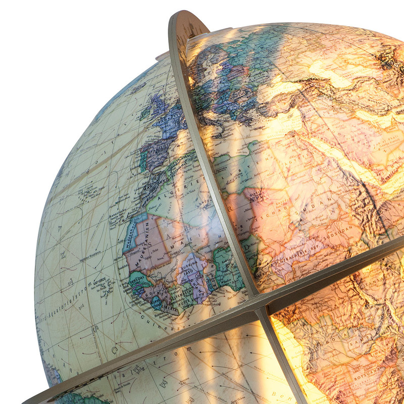Beleuchtet strahlt es mit seiner harmonischen Farbgebung eine besondere Wärme aus und unterstreicht den traditionellen Charakter der entsprechend ausgestatteten Globen und zeigt Ihnen detailliert die Gebirgszonen und Höhenzüge unserer Erde.