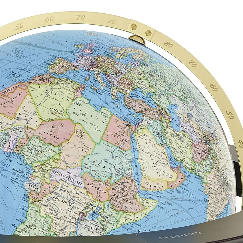 Dieser Globus zeichnet sich durch seine mundgeblasene Kristallglaskugel sowie Perlmutt-Intarsien in altdeutschen Nussbaum-Gestühl aus. Weltweit gibt es nur wenige Glashütten, die in der Lage sind, Kristallglaskugeln mit einem Durchmesser von 51 cm zu blasen.