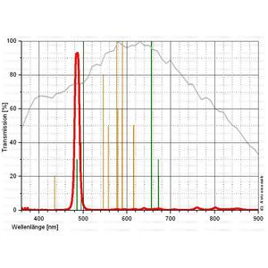 Je nach Art des Himmelsobjektes kann man jedoch einen Teil des störenden Lichts wegfiltern, und damit die Beobachtung der Objekte erleichtern. Ein H-beta Filter nutzt dabei die Eigenschaft der sogenannten Emmissionsnebel aus. Manche Objekte leuchten in bestimmten Farben, den sogenannten Emmissionslinien. Die Emmissionslinien sind mit bestimmten chemischen Elementen verknüpft - in diesem Fall Wasserstoff. Dieser hochwertige Nebelfilter blockt dabei alle anderen Farben und damit auch fast das gesamte künstliche Licht ab, und läßt nur die Emmissionslinie des Wasserstoffs durch. Der Effekt ist verblüffend: Plötzlich werden Nebel an Stellen sichtbar, die ohne Filter vollkommen leer erscheinen. Bei leicht aufgehelltem Himmel ist zum Beispiel der Pferdekopfnebel mit einem 300mm Teleskop praktisch nicht sichtbar. Bei Einsatz dieses Filters kann man den Nebel vollkommen problemfrei sehen. Ein Muß für jeden visuellen Amateurastronomen!