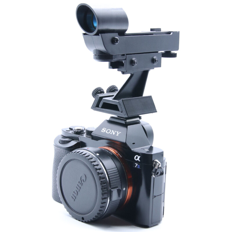 Es ist gar nicht so einfach, nachts eine Spiegelreflexkamera auf das gewünschte Objekt auszurichten. Falls man nicht gerade sehr helle Objekte wie den Mond, Planeten oder helle Sterne zur Verfügung hat, hilft dabei weder ein Blick durch den Kamerasucher, noch der LiveView an der Kamera. Mit diesen Adapter können Sie Leuchtpunktsucher von Celestron, Skywatcher oder Omegon auf dem Blitzschuh befestigen.