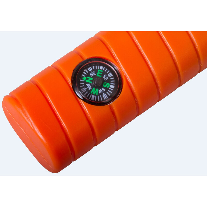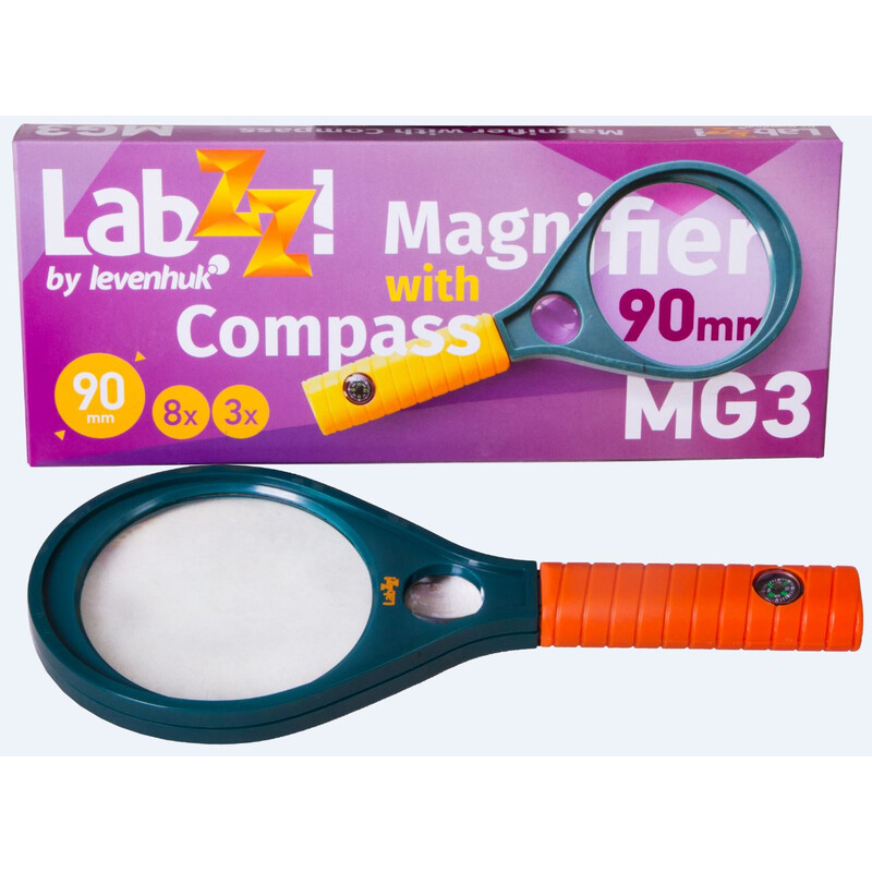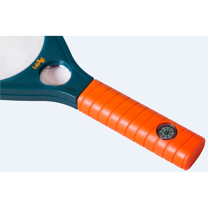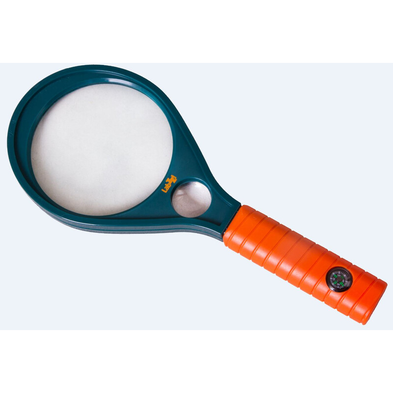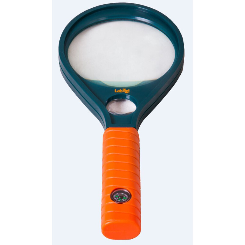 Die größere Linse ist nützlich zum Lesen oder Ansehen von Bildern. Die kleinere ist ideal zum Studieren kleiner Objekte. Ein mechanischer Kompass mit Himmelsrichtungen und Skalenscheibe ist in den Griff eingebaut.
