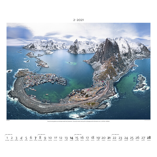 Das großzügige Format dieses Wandkalenders bringt die 12 eindrucksvollen Luftaufnahmen voll zur Geltung. Das Kalendarium darunter ist bewusst zurückhaltend gestaltet, um den Motiven viel Raum zu geben.