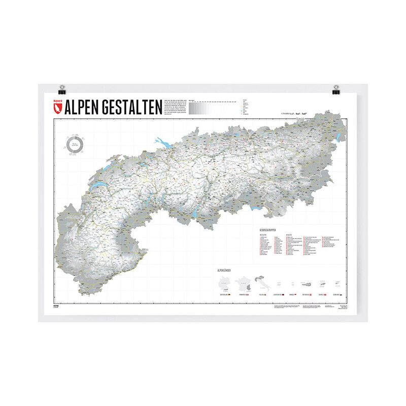 Das Grundgerüst unserer Karte besteht aus Höhenlinien im Abstand von 250 Metern. So wirkt die Karte plastisch und gibt die Topographie der Alpen gut wieder. Neben den Grenzen der acht Alpenländer und ihrer Regionen sind die wichtigsten Straßen, Alpenpässe und Flüsse, sowie Städte und Berge als Orientierungspunkte eingezeichnet. Auf der Karte sind auch die Grenzen der Regionen der einzelnen Alpenländer eingezeichnet. 63 Gebirgsgruppen der Alpen nach der Definition von Paul Zahn sind auf der Karte markiert und aufgelistet.