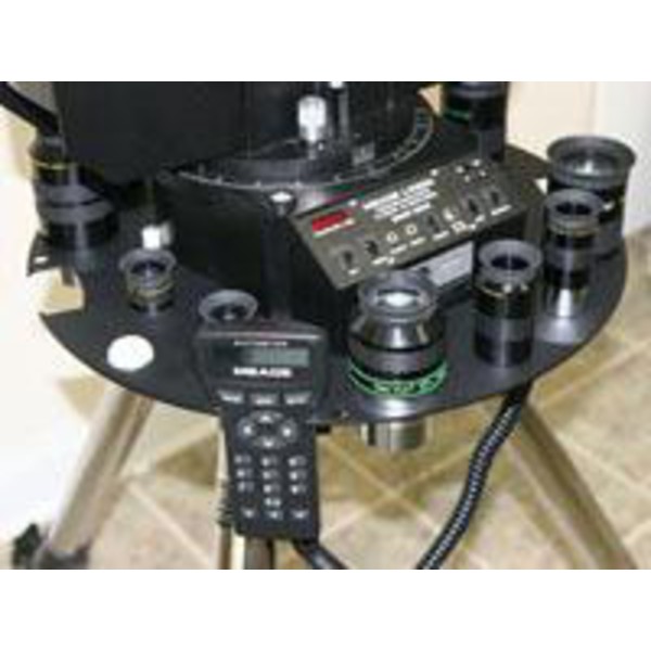 Wird einfach auf das Stativ geschraubt und kann dort verbleiben. Die Ablage nimmt 5 Stück 2'' und 9 Stück 1.25'' Okulare auf. Aussparungen für die neue AutoStar Handbox, sowie für die LX200 Classic Handbox sind auch vorhanden.