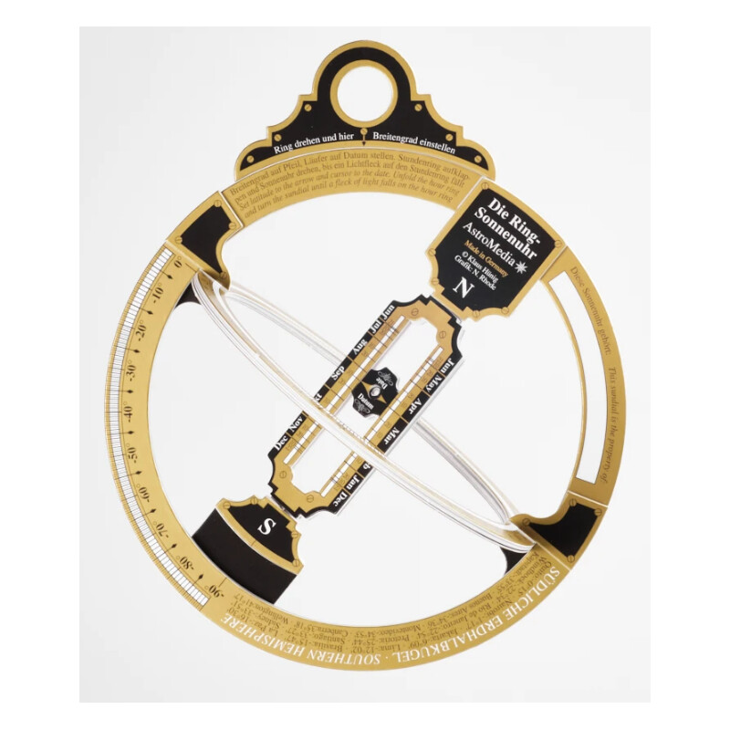 Die Königin der Sonnenuhren: Weit bevor es unsere heutigen Armbanduhren gab, wussten Menschen tragbare Zeitmesser schon zu schätzen. Dazu verwendeten sie eine ringförmige Sonnenuhr, die sie an einer Halskette trugen. Die Ring-Sonnenuhr von AstroMedia ist dafür vielleicht etwas zu groß, aber dennoch ein echtes Schmuckstück. Sie zeigt ihrem Benutzer die wahre Sonnenzeit an jedem Ort der Erde, sofern man die geografische Breite des Ortes sowie Monat und Tag kennt. Vor allem muss man, im Gegensatz zu den meisten anderen Sonnenuhren, nicht wissen, wo sich die Himmelrichtungen befinden: Die Ring-Sonnenuhr nordet sich von selbst ein, vorausgesetzt man weiß, ob es gerade vor oder nach dem Mittagsstand der Sonne ist.