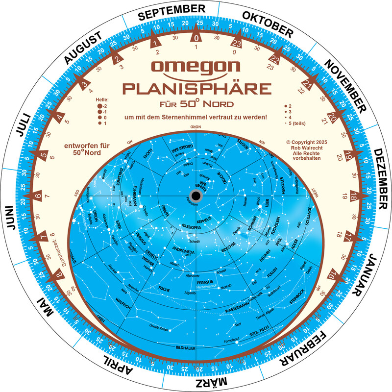 Raten Sie nicht länger, was das für Sterne über Ihnen sein könnten. Der Große Wagen, der Schütze, das Sommerdreieck: Mit der Omegon drehbaren Sternkarte haben Sie das Wissen über die Sternbilder und wo sie zu finden sind schon in der Tasche. Diese Karte enthält alle Sternbilder des nördlichen Himmels plus viele DeepSky-Objekte für Ihre Beobachtungen. Damit Sie sich zu jeder Uhrzeit und Jahreszeit am Himmel auskennen, als hätten Sie es schon immer gewusst.