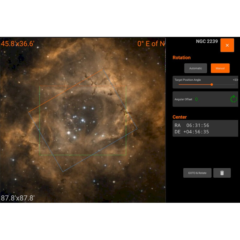 - Erkunden Sie eine maßgeschneiderte Liste von Zielen, die für Ihre aktuelle Zeit und Ihren Standort geeignet sind. Ein-Klick-Goto, um das Ziel mit einer Genauigkeit von weniger als einer Bogensekunde in der Kamera zu zentrieren.