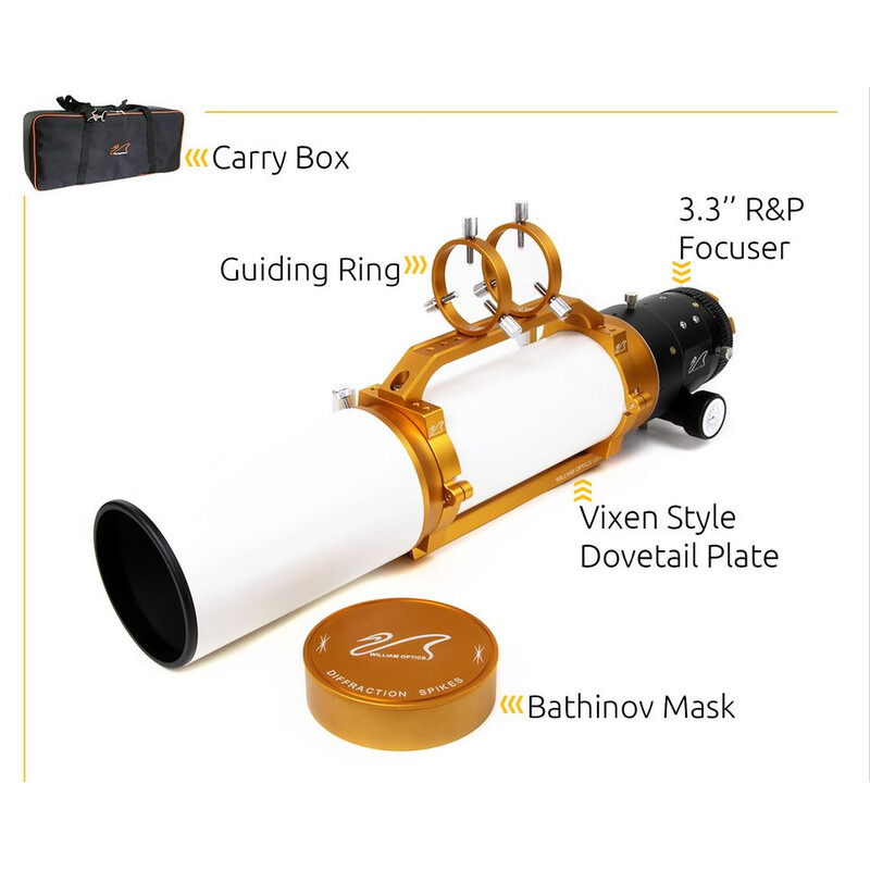 - Für die Astrofografie stehen Ihnen gleich mehrere Bildfeldebner und Brennweitenreduzierer (Flattener/Reducer) von William Optics zur Verfügung. Statten Sie Ihr Gran Turismo mit einem Guiding Scope aus, das Ihnen als Sucher oder Leitrohr dienen kann. Die Leitrohrschellen sind bereits im Lieferumfang enthalten. Der Apo ist ausgelegt für die Fotografie von DeepSky-Objekten mit Vollformat-Kameras.